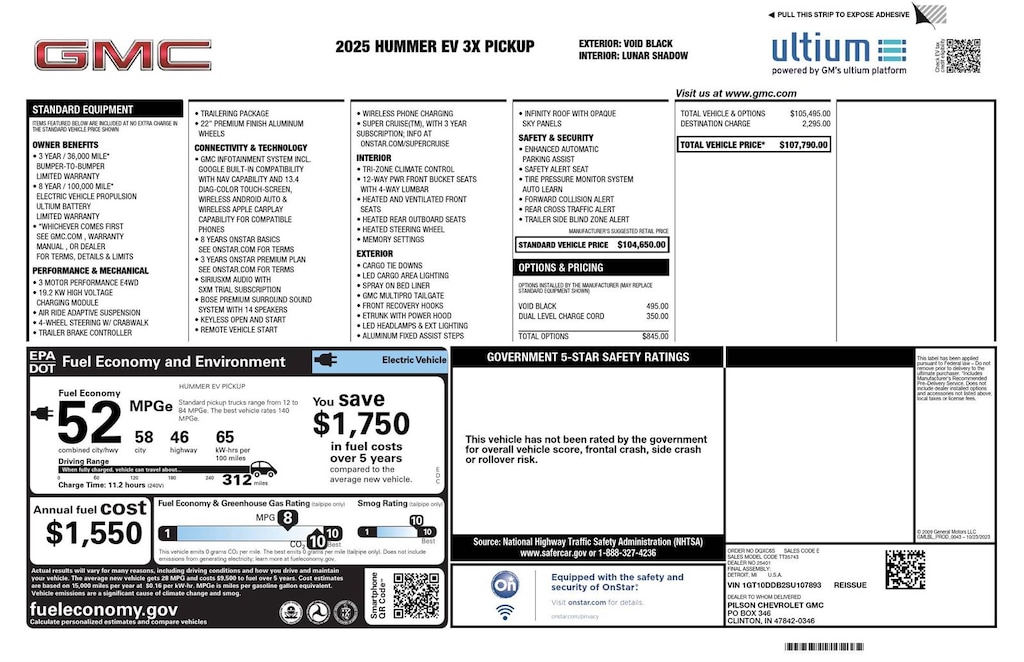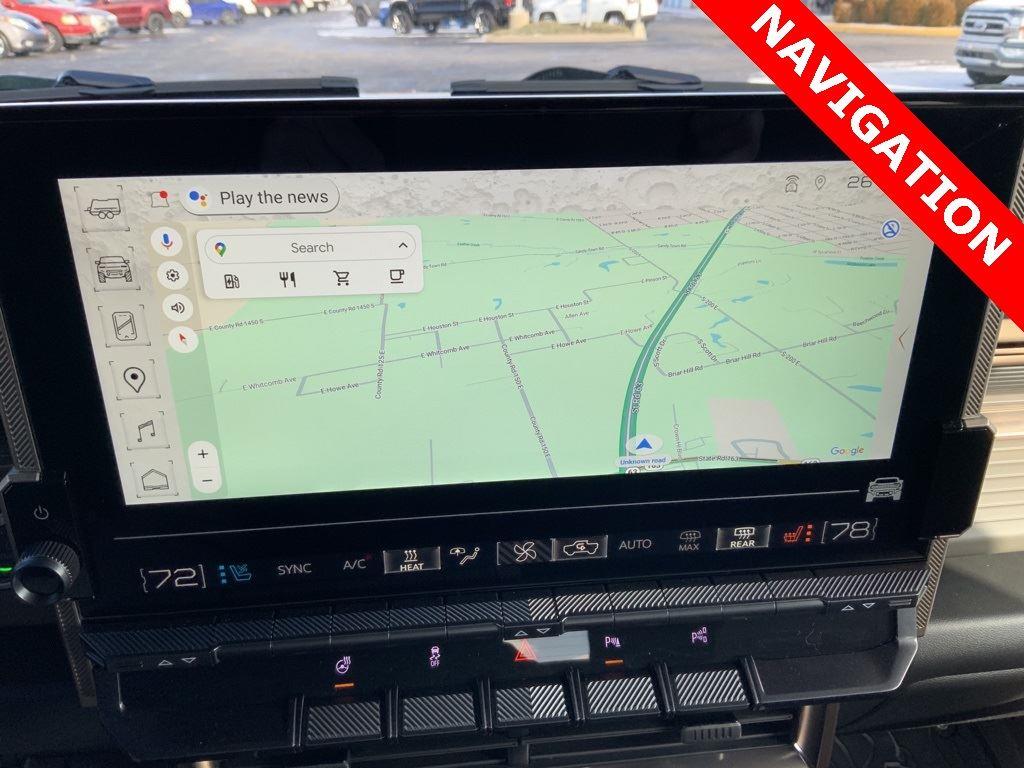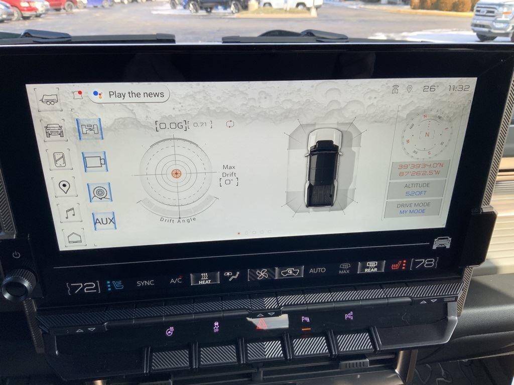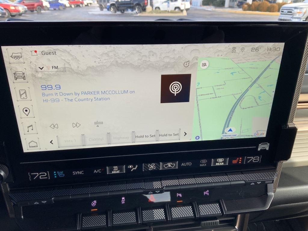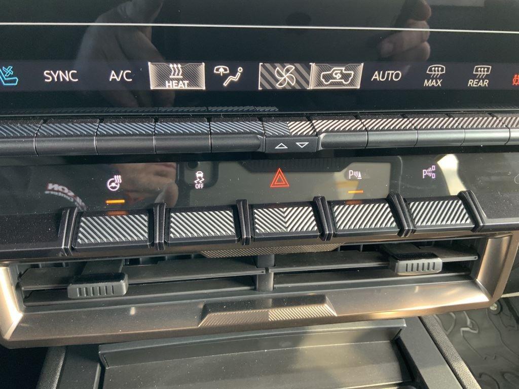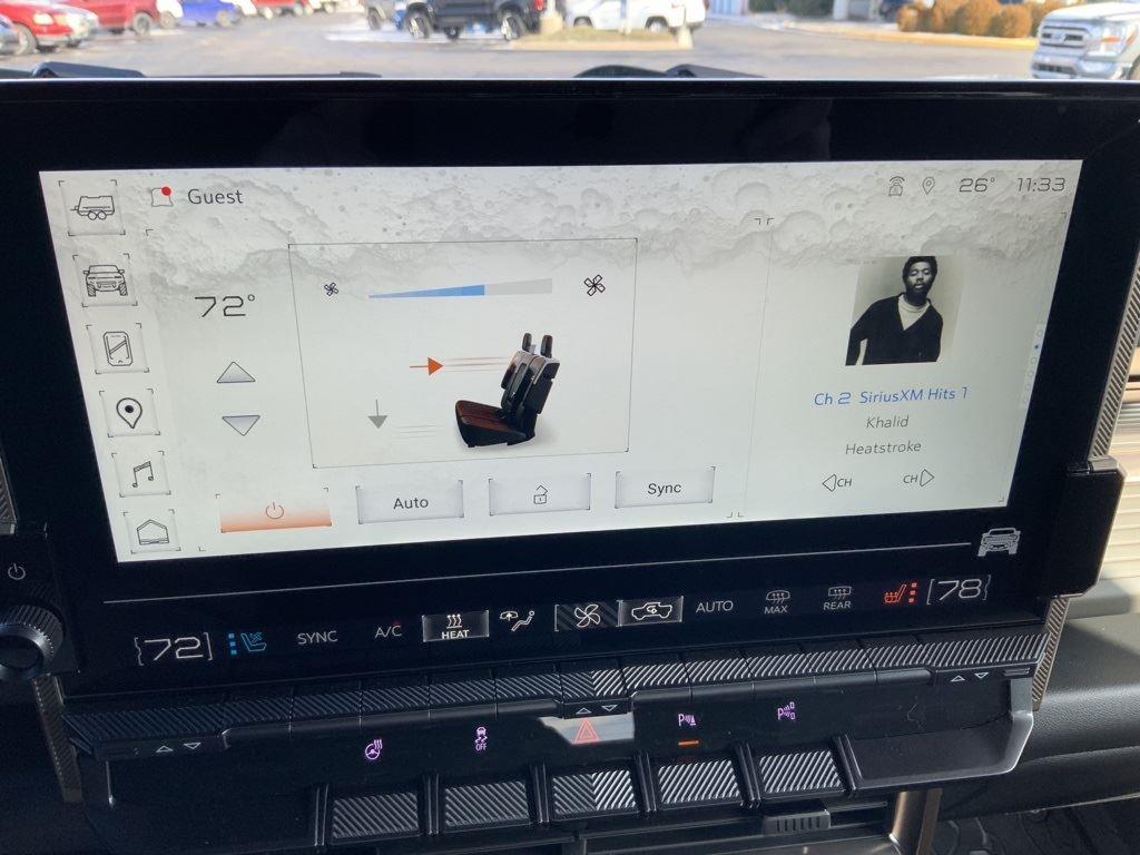Front Drive Unit, 1-motor, Integrated Inverter, Park System, Rear Drive Unit, 2-motor, Integrated Inverter, Torque Vectoring Drive System, Drive Mode Control includes My Mode, Normal, Off-Road, Terrain and Tow/Haul, Regen on Demand, steering wheel paddle, regenerative braking, Trailer brake controller, integrated, Hitch Guidance, Trailering Information Label provides max trailer ratings for tongue weight and conventional towing, Suspension, Adaptive Air Ride, front and rear with adjustable ride height and Extract Mode, Wi-Fi Hotspot capable (Terms and limitations apply. See onstar.com or dealer for details.), Seat adjuster, driver 12-way power including 4-way lumbar, Seat adjuster, passenger 12-way power including 4-way lumbar, Seats, heated second row outboard seats, Remote vehicle starter system, pre-conditioning, Universal Home Remote, Power outlet, rear center console, 120-volt (400 watts shared with (KC9) bed mounted power outlet), USB ports, rear, dual, charge-only, StabiliTrak, stability control system with Proactive Roll Avoidance and traction control, includes electronic trailer sway control and hill start assist, Reverse Automatic Braking, Pedestrian safety signal automated external sound generator at low speeds alerts pedestrians of vehicle presence, Bed View Camera camera in the CHMSL to show a view of the cargo bed, display located in infotainment screen, Trailer Vision, rear view, Trailer Side Blind Zone Alert, Tire Pressure Monitoring System with Auto Learn, Safety Alert Seat, Rear Cross Traffic Alert, Rear Pedestrian Alert, Enhanced Automatic Parking Assist, Following Distance Indicator